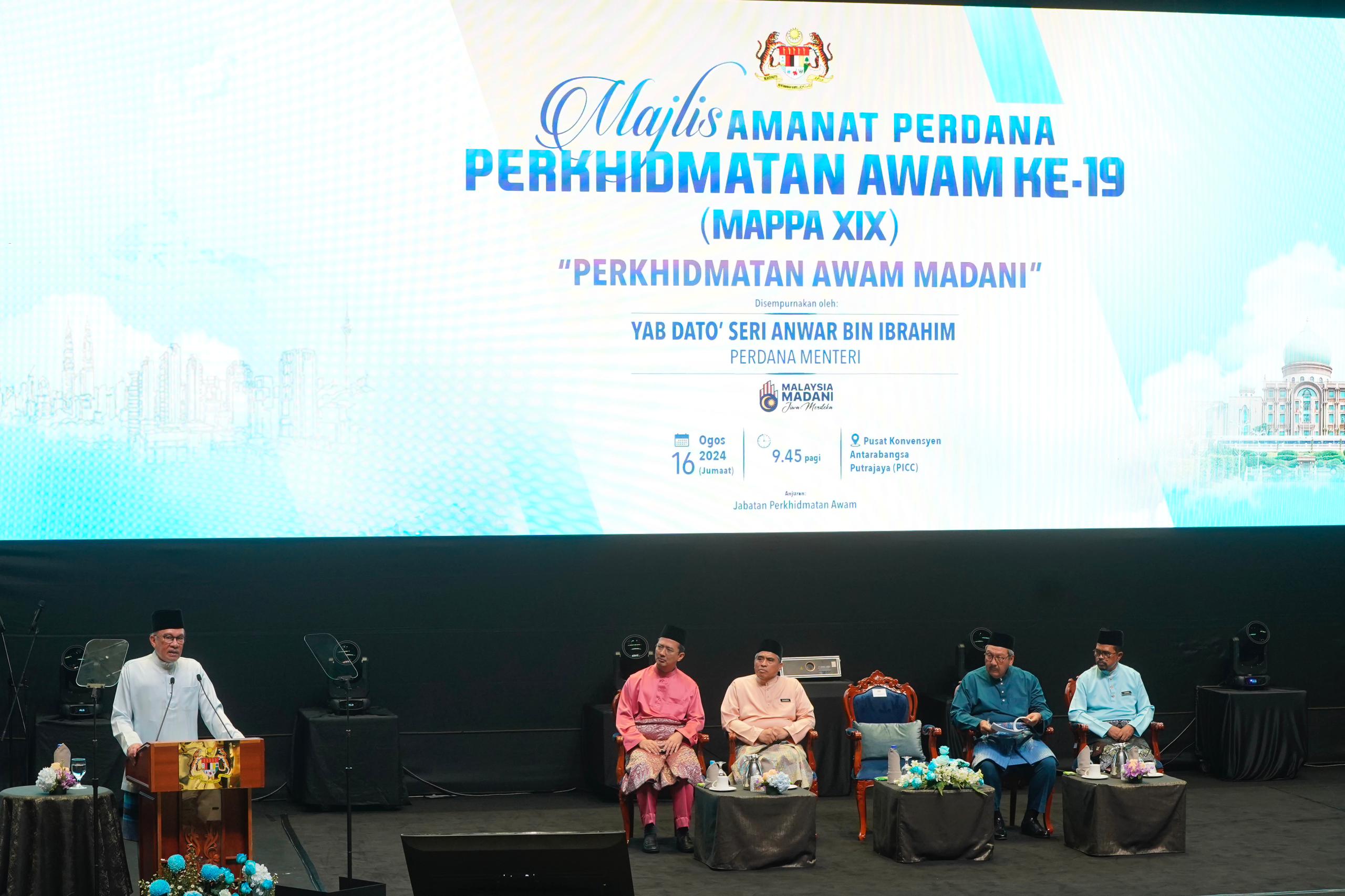 16 Ogos 2024, Putrajaya - YAB Dato’ Seri Anwar bin Ibrahim, Perdana Menteri telah menyampaikan amanat sempena Majlis Amanat Perdana Perkhidmatan Awam Ke-19 2024 bertempat di PICC, Putrajaya.
