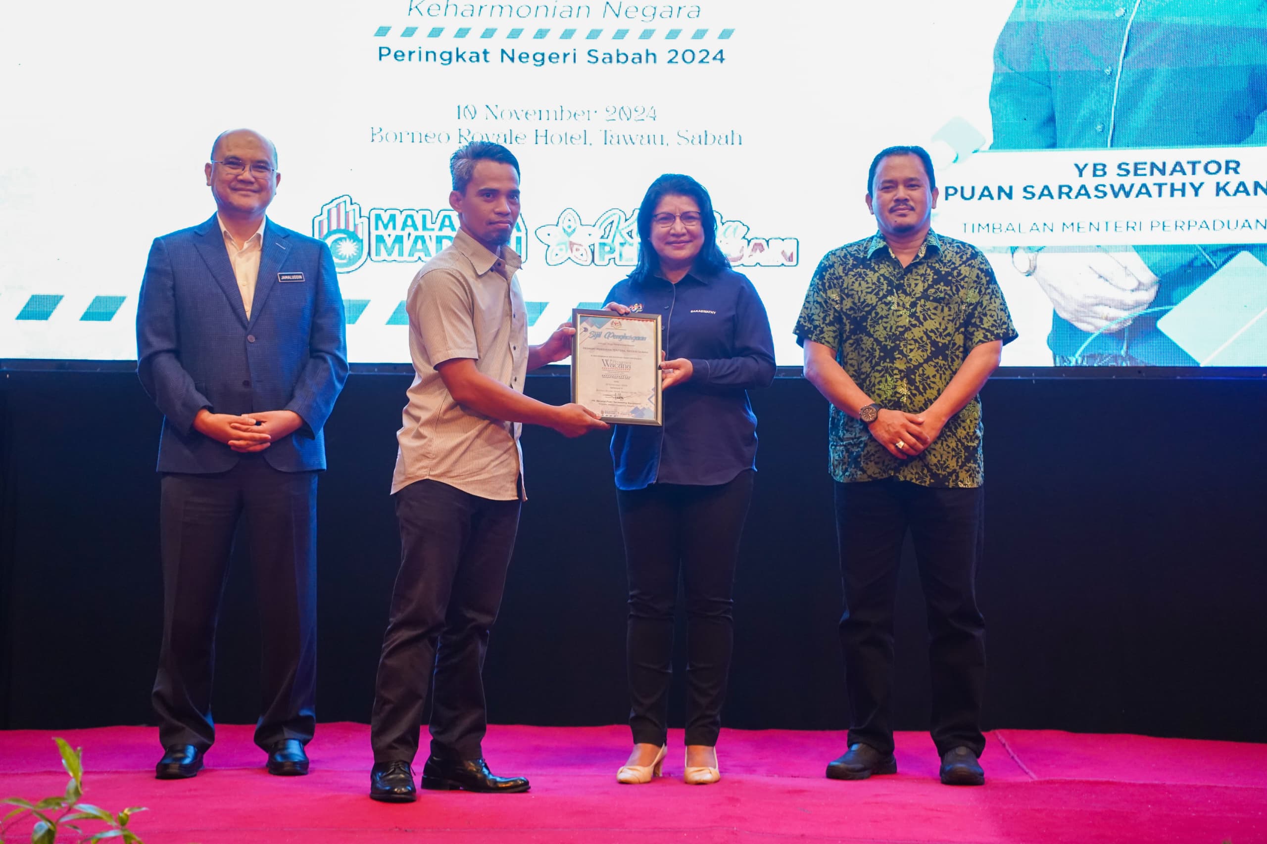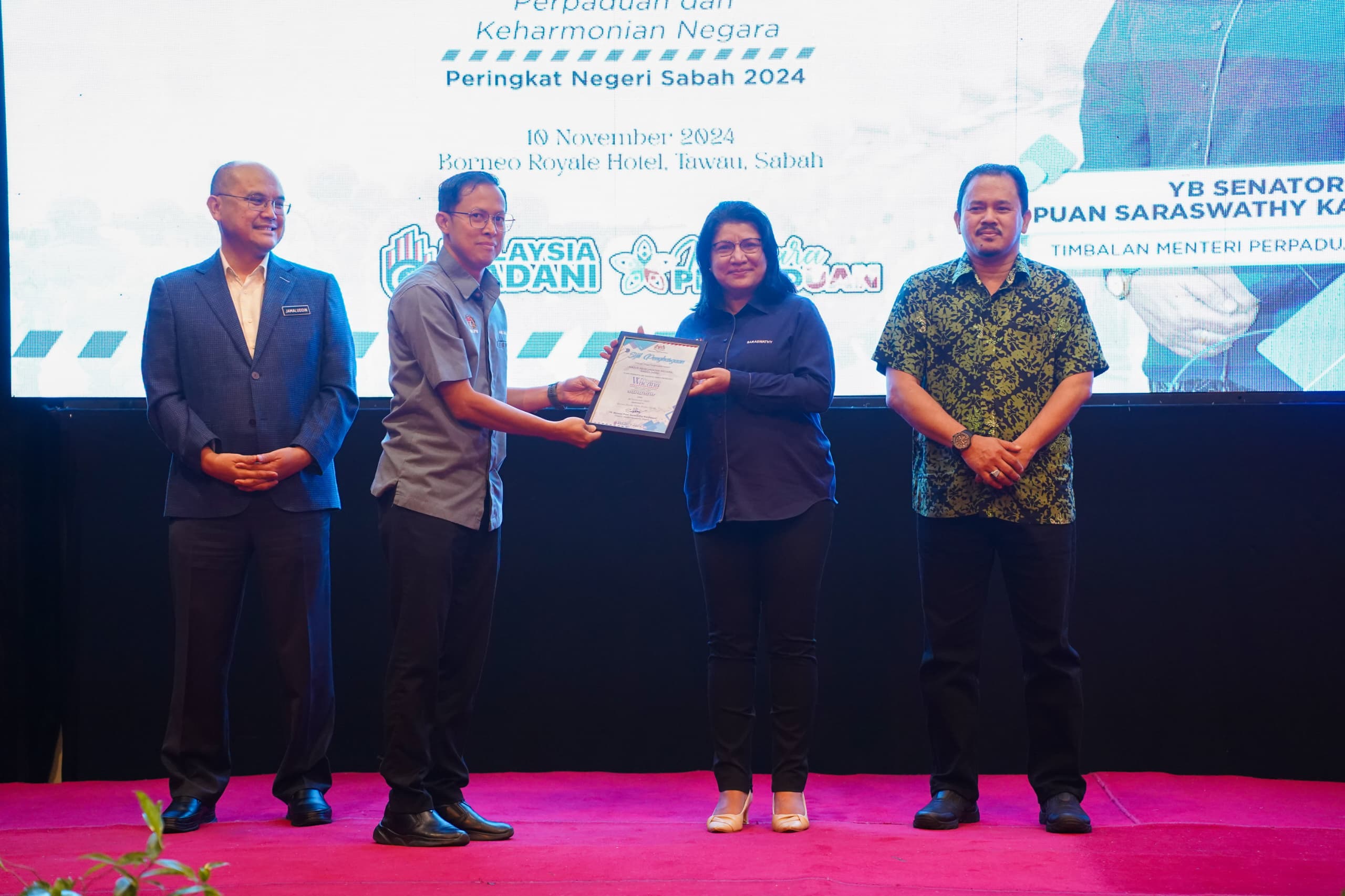 10 November 2024, Sabah - Kementerian Perpaduan Negara telah menganjurkan Program Wacana Kelestarian Keselamatan, Perpaduan dan Keharmonian Negara Peringkat Negeri Sabah Tahun 2024 yang telah disempurnakan oleh YB Senator Puan Saraswathy Kandasami, Timbalan Menteri Perpaduan Negara di Dewan Hotel Borneo Royale, Tawau, Sabah.